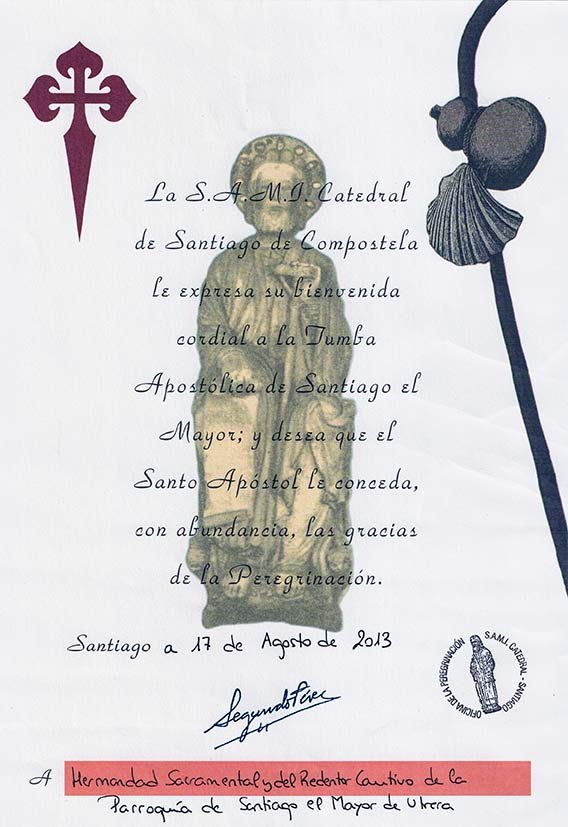 Peregrinación a la Tumba del Apóstol Santiago Una representación de nuestra Hermandad, ha peregrinado a la tumba del Apóstol Santiago, llegando a la Catedral de Santiago de Compostela el pasado 17 de agosto de 2013, recibiendo un reconocimiento para la Hermandad.