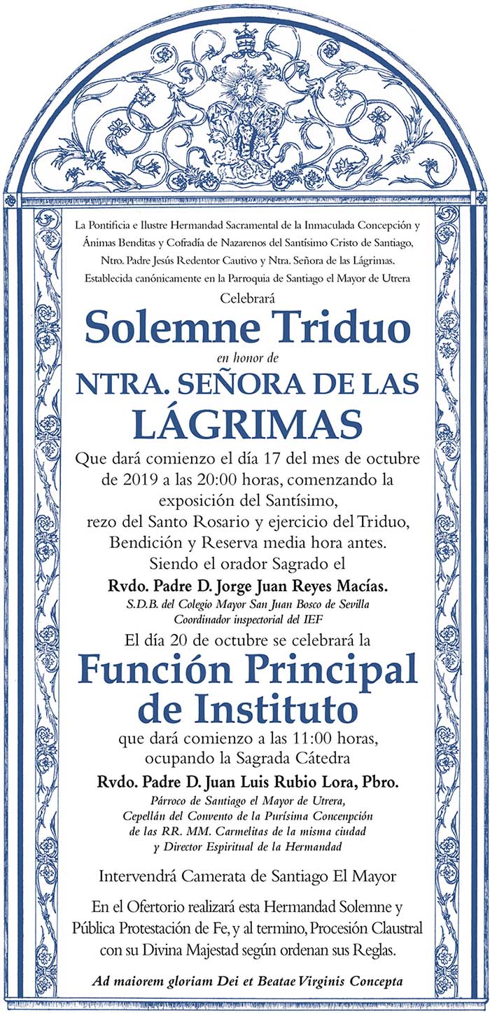 Se ha celebrado Solemne Triduo en Honor de Ntra. Sra. de las Lágrimas entre los días 17 al 19 de octubre, comenzando a las 20 horas con exposición del Santísimo, rezo del Santo Rosario y ejercicio del Triduo, Bendición y Reserva media hora antes. Siendo el orador Sagrado el Rvdo. Padre D. Jorge Juan Reyes Macías S.B.D. del Colegio Mayor San Juan Bosco de Sevilla, coordinador Inspectorial del IEF.