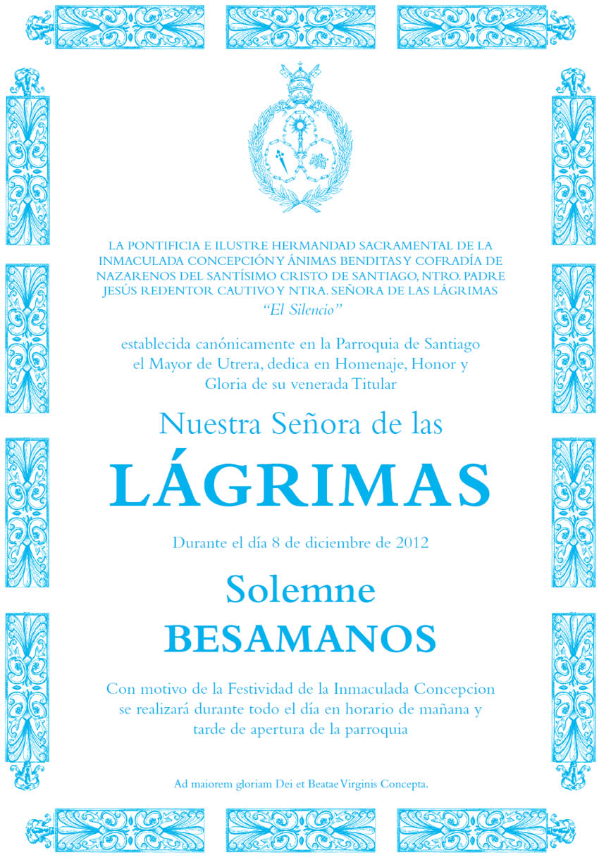 Solemne Besamanos a Ntra Sra de las Lágrimas La imagen de Ntra de las Lágrimas ha permanecido en Besamanos en horario de mañana y tarde el pasado día 8 de diciembre de 2012 con motivo de la Festividad de la Inmaculada Concepción.