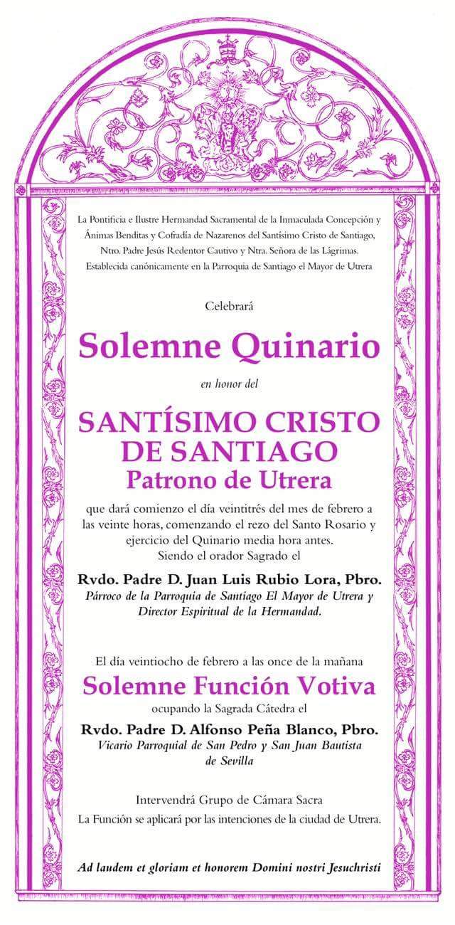 El Solemne Quinario en Función al Santísimo Cristo de Santiago, patrono de Utrera, se he celebrado entre los días 23 al 27 de Marzo de 2017, con ejercicio de Quinario a las 20 horas, comenzando media hora antes el rezo del Santo Rosario.