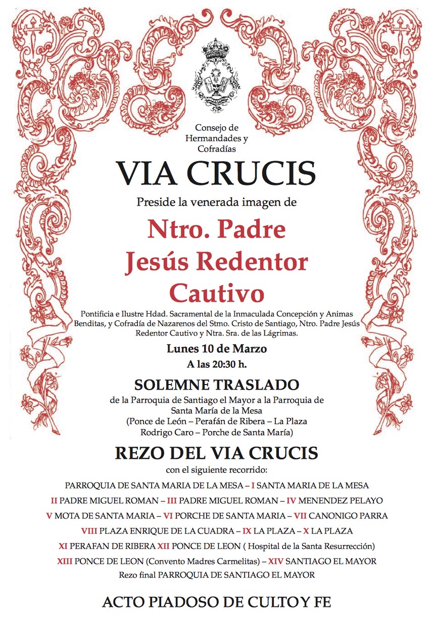 | ESPECIALES | Especiales Viacrucis Consejo de Hermandades y Cofradías de Utrera El Viacrucis organizado por el Consejo de Hermandades y Cofradías de Utrera de este año, se realizó el pasado 10 de marzo de 2014, estando presidido por la venerada imagen de Ntro. Padre Jesús Redentor Cautivo, fue trasladado en andas desde la Parroquia de Santiago a la de Santa María de la Mesa con el siguiente itinerario: Ponce de León, Perefán de Rivera, La Plaza, Rodrigo Caro y Porche de Sta María. Viacrucis