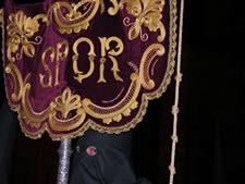 Es un guión, en terciopelo rojo, bordado en oro por las Reverendas Madres Carmelitas, fijado a un asta repujada en metal plateado y rematada por escudo romano con corona de laurel realizada en el taller de D. Manuel de los Ríos en 1989. |