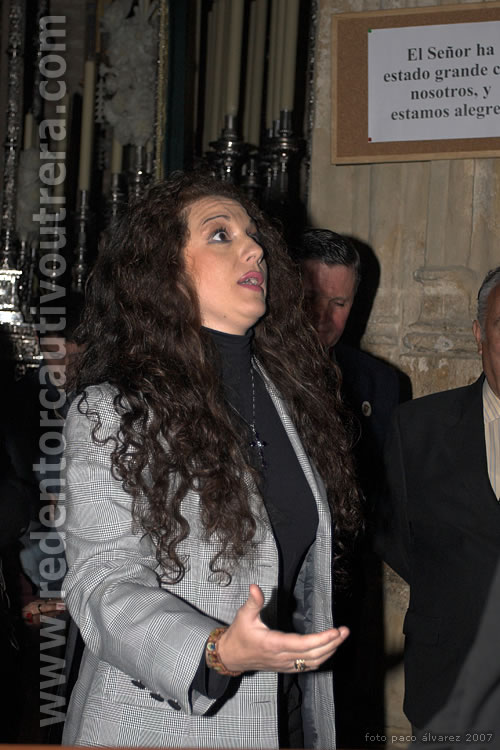 En este mismo acto tuvimos la oportunidad además de escuchar las voces únicas del Coro Siarum y también dos saetas, una cantada por Frasco y otra por Mónica Azahar (tercer premio de copla de la canción española en el Teatro Enrique de la Cuadra), a Frasco ya lo conocemos, Hermano del nuestra Hermandad desde hace muchísimos años y que asiduamente nos regala su melodiosa voz, y Mónica, cantaora y saetera que por seguirillas le dedicó su saeta al Cautivo.