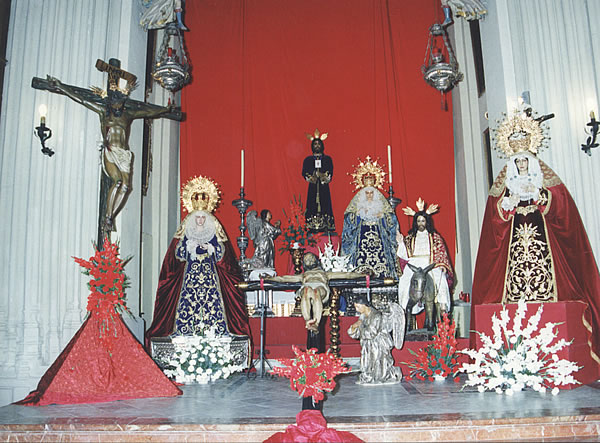 La única vez que se ha podido ver a las imagenes titulares juntas en el Altar de Santiago, son las tres Hermandades que tienen su sede Canónica en la Parroquia de Santiago El Mayor.