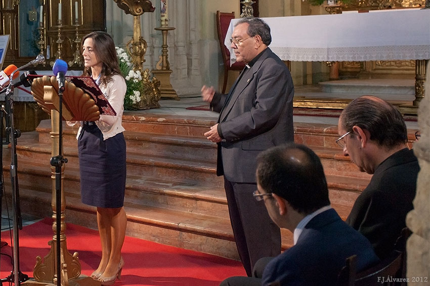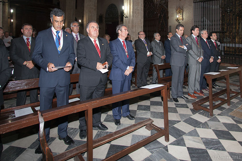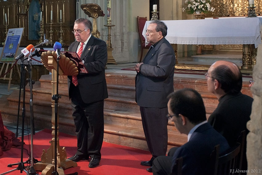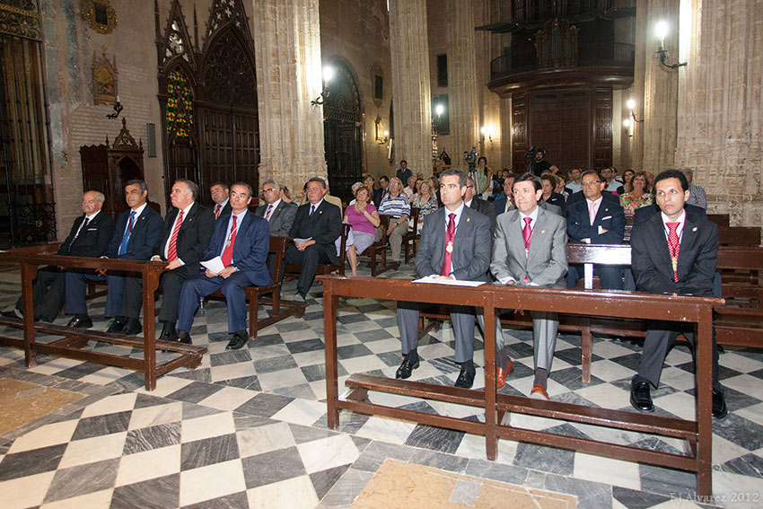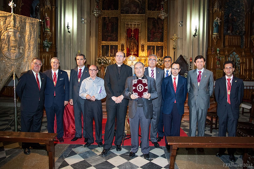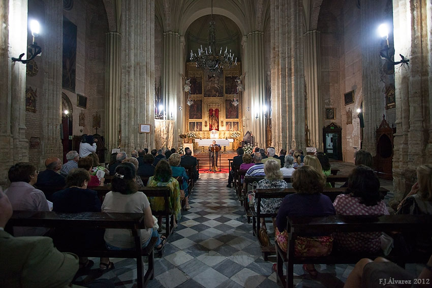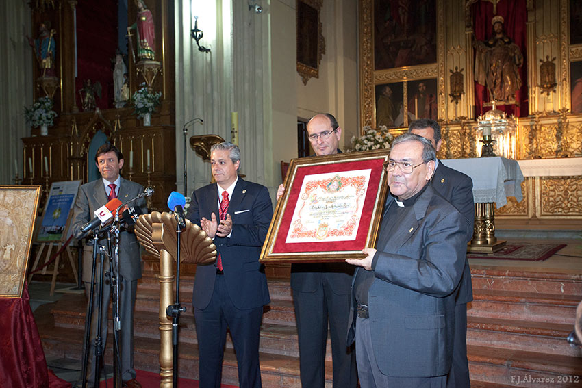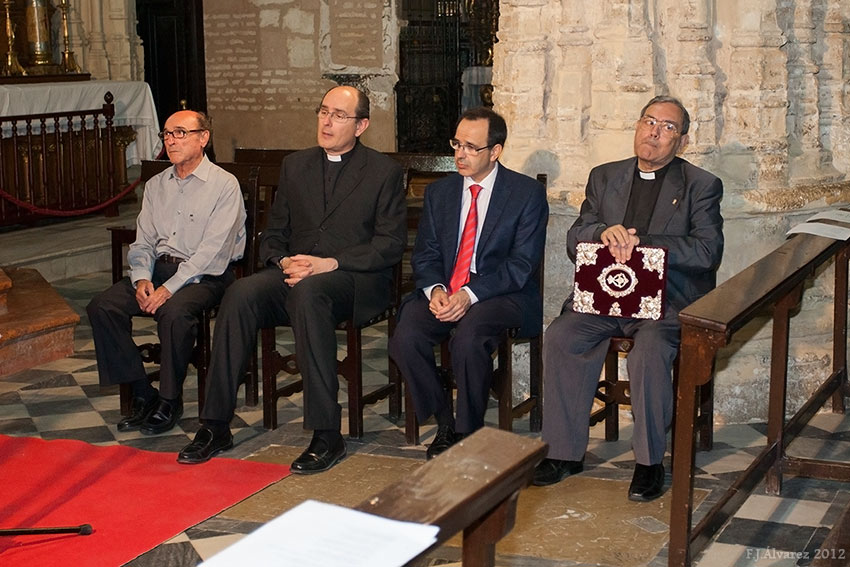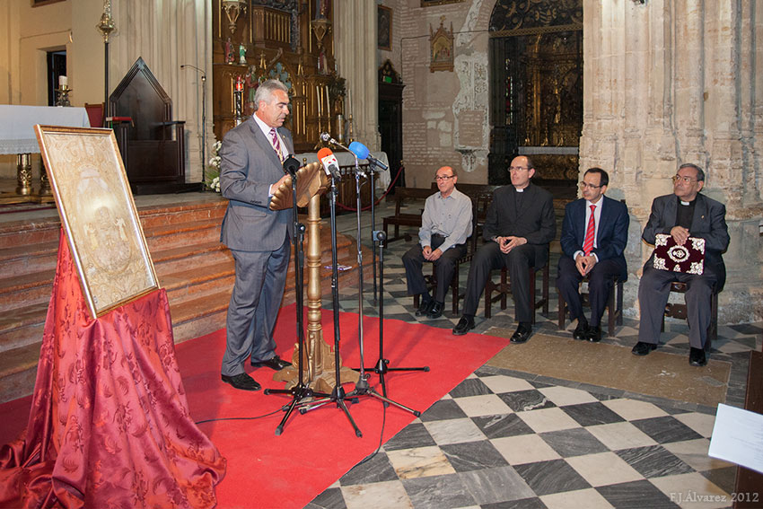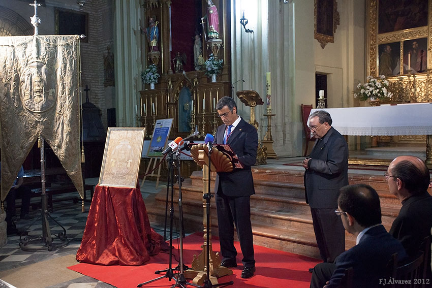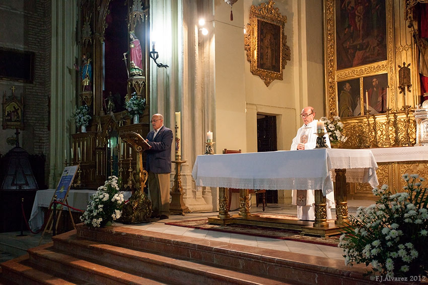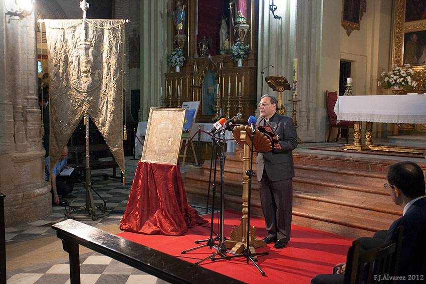 Presentación Cartel Junio Eucarístico y Exaltación a la Eucaristía 2012 El pasado sábado día 02 de Junio a las 20:30 horas, en la Parroquia de Santiago El Mayor de nuestra ciudad de Utrera, tras la Santa Misa Dominical se presentó oficialmente el cartel "Junio Eucarístico 2012", cuya fotografía y diseño del mismo, ha sido realizado por D. Francisco José Alvarez Adamuz. Posteriormente fué la exposición verbal sobre la Exaltación a la Eucaristía a cargo del Rvdo. Padre D. Antonio Jesús Rodríguez de Rojas S.D.B., el cual fue presentado por D. Manuel Orellana Delgado, hermano mayor de la Hdad. de Los Estudiantes de Utrera. El cartel de este año 2012 se basa en el Estandarte de la primigenia Hermandad Sacramental y de Ánimas Benditas, actualmente fusionada con la Cofradía de Nazarenos del Santísimo Cristo de Santiago, Ntro Padre Jesús Redentor Cautivo y Ntra Sra de las Lágrimas. El citado estandarte fue elaborado en 1823 por D. Juan Bautista Carrasco y Alaras, sobre fondo de tisú de plata. Respecto al diseño, el autor Fco José, comentó que en otro caso hubiera sido bueno que los textos y logotipos resaltaran para que fueran de fácil lectura desde lejos, pero ha preferido en esta ocasión, darle siempre la máxima importancia a los detalles de éste magnífico bordado.