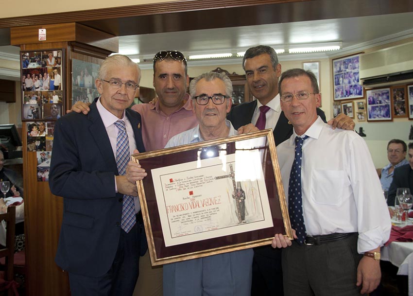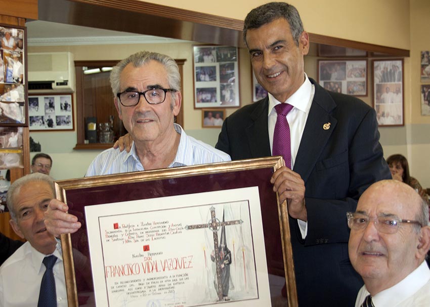 Homenaje a nuestro hermano D. Francisco Vidal Vázquez En la Comida Convivencia de la Función de Ntra. Sra. de las Lágrimas el pasado día 20 de octubre se homenajeó a nuestro hermano D. Francisco Vidal Vázquez, más conocidos por todos como Frasco. El motivo de dicho homenaje fue la labor desinteresada que ha realizado para la hermandad durante toda su vida, destacando su labor como capataz del paso de palio de Ntra. Sra. de las Lágrimas, siéndolo de forma ininterrumpida desde el año 1976 al 2004.