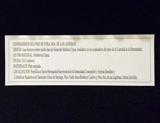 De los talleres de Juan Borrero han salido también la Corona para Ntra. Sra. de las Lágrimas, que fue bendecida el 1 de marzo de 2013, primer viernes de mes, en la Función en Honor a Ntro. Padre Jesús Redentor Cautivo, es una obra realizada en plata de ley sobredorada por Juan Borrero de Orfebrería Triana.