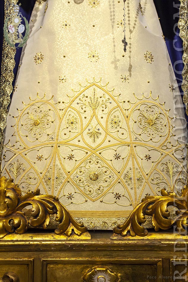Ntra. Sra. de las Lágrimas estrena nueva saya Nuestra Señora de las Lágrimas estrena una nueva saya coincidiendo con los Cultos a la Inmaculada Concepción. La Saya está confeccionada en tisu de oro con aplicaciones de oro de ley, cristales de Swarovski engarzados en plata y aplicaciones en miniatura también de oro con cordonería del mismo material. La presea es un diseño de D. Sebastián Martínez Zayas inspirada en los dibujos neogóticos del paso del Niño Jesús Eucarístico, confeccionada en el taller de Dña. Inmaculada García-Rayo Guerrero y donada por su camarera a la que nuestra Hermandad le estará eternamente agradecida |